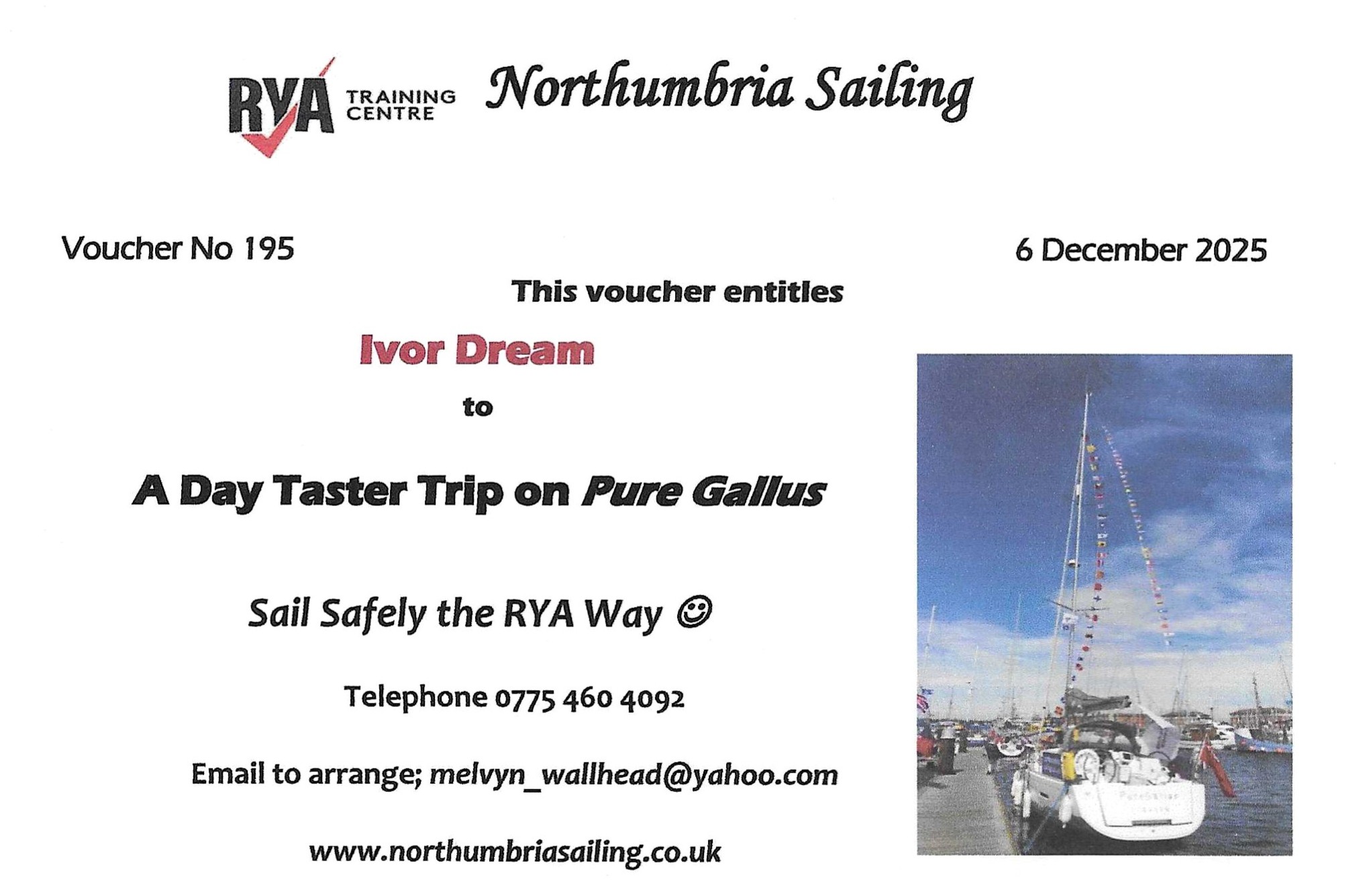 Melvyn Wallhead, Yachtmaster & RYA Shorebased Instructor. I started this business in 2009, never expecting the school would grow to the present level and have delivered RYA practical courses from 2011 to 2023. The North East has a long maritime tradition but potential mariners have had to go outside the area. I have sailed all over; UK, Med, Europe, Caribbean, Thailand, four continents in all and hope I can encourage others to do the same, without the ‘incidents’.