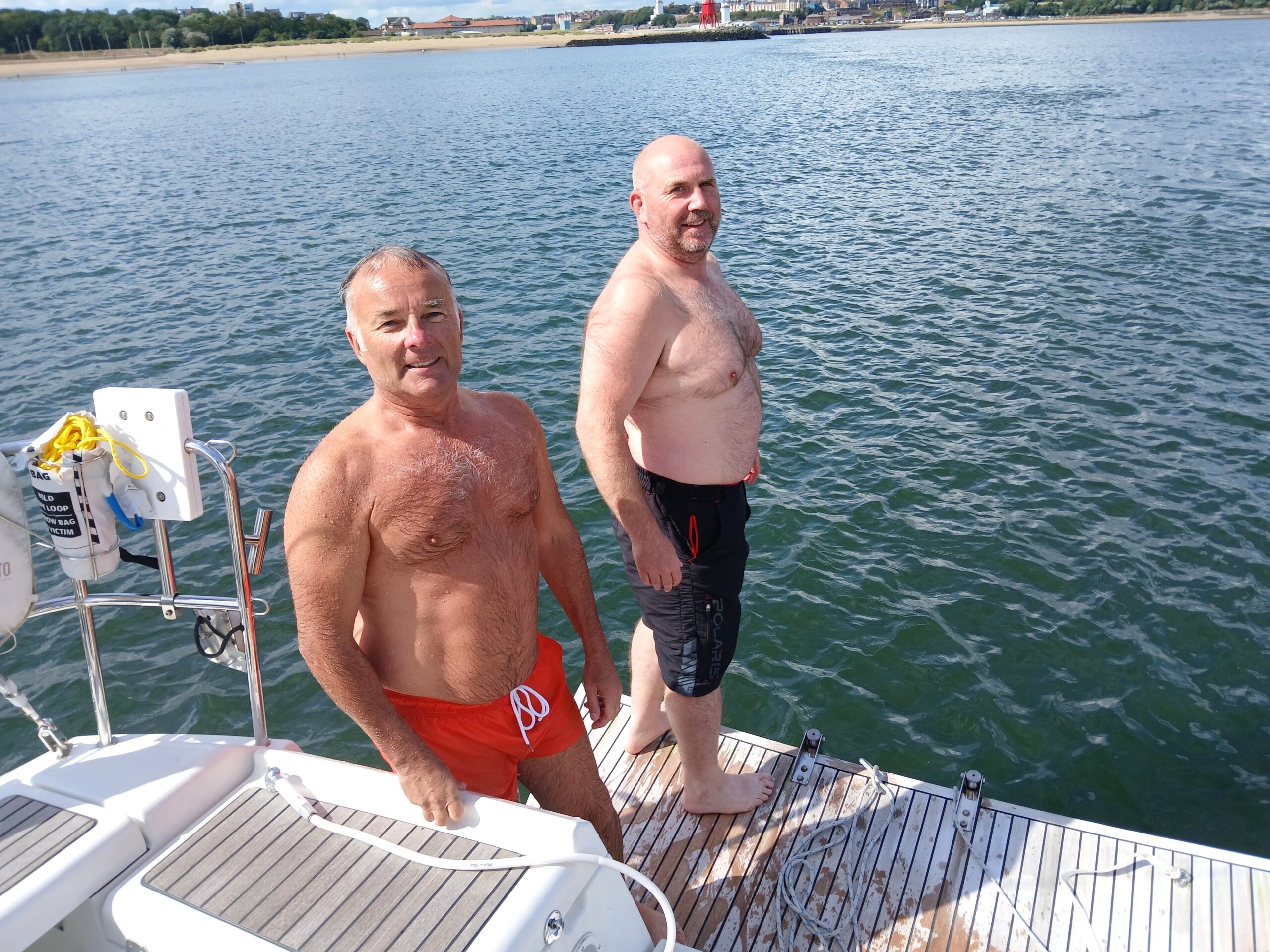 Pure Gallus has a bathing platform, which has never been used as such in my ownership, but this was about to change. The Yorkshire Adventure Trip returned to the Tyne via Sunderland when it was clear that banging down to Whitby against a southerly wind was untenable, and I received a bathing request from victims. Here you see clothed and unclothed versions, David & Garry both dived in, Nicola swam round the boat, Peter and I were left onboard. The day finished off with celebrations on Newcastle Quayside.