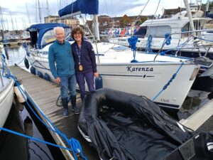 Daphne gave her husband Jonathan a lift on Great North Run Day. Not during, but afterwards, meeting the successful runner on Little Haven beach via their yacht Karenza. Transport queues were avoided by boat!