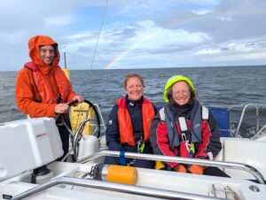 We were treated to a rare sight, 2 rainbows, during this Stayover 3 Day Practical Crewing. Unaccustomed to rain were Sarah, Kate & Philip. Medic Sarah hankers after treating seafarers on a Tall Ship.