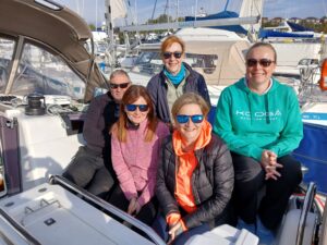 PRACTICAL CREWING My version of RYA Competent Crew. Three days, 0930-1700hrs onboard for up to four ideally, sometimes five, and you will be up to the Comp Crew standard. No experience necessary and no need to stay onboard overnight. Here we see with myself; David, Matthew, Steve & Jo.  Cost £375. Next Course; 2026 March 26 – 28th (1 booked already!) Book now for 2025 price. We would like to say a thank you to you and Steve. We’ve had a brilliant few days. Steve is a great teacher and was so lovely and patient.’ – Jill