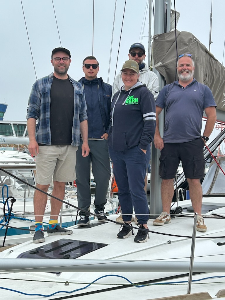 On the foredeck of Pure Gallus are; Gary, Jay, Pawel, Carly & Cameron.